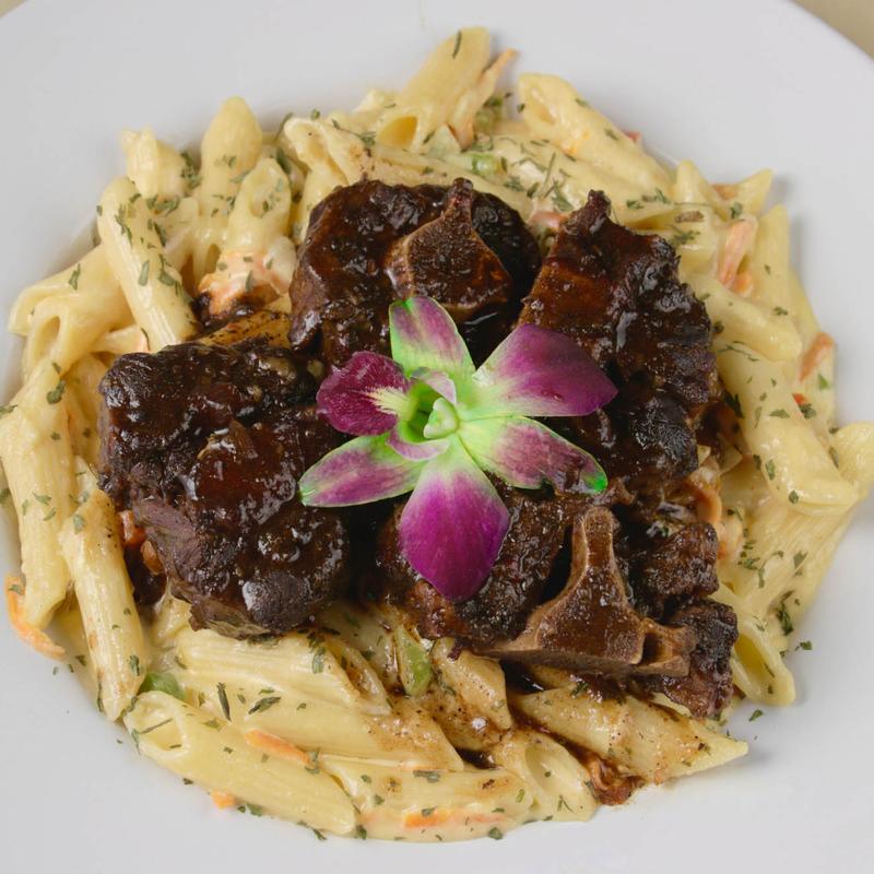 Cooked at high temperatures until soft and tender, then marinated in a sweet finger licking gravy. Served with rice and peas, steamed cabbage and plantain.